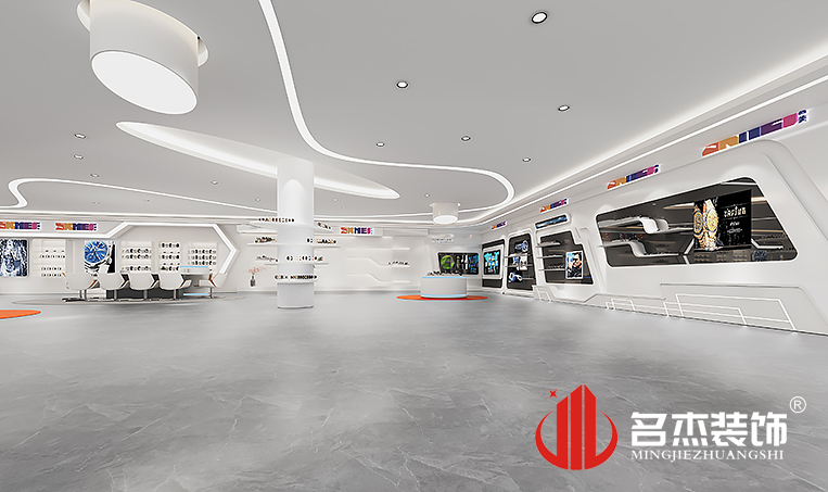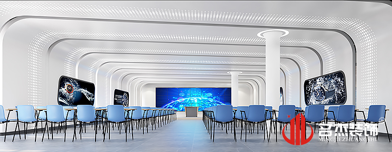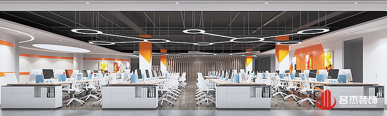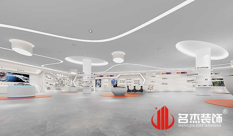前臺區域當中加入兩個大型的圓弧形的燈具造型,讓空間的設計感一下子就出來了,同時在加入logo色作為點綴色,讓空間中充滿活力。整體設計當中也是在多處加入橙色活躍色來點綴,空間也變得更加有活力,再加上各個區域也有圓弧型元素和企業的銷售的產品形成相互呼應,能讓產品的要素更加深入人心。