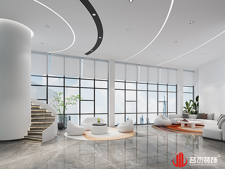 整體辦公裝修設(shè)計空間的設(shè)計格調(diào)是時尚輕奢的風(fēng)格,在前臺區(qū)域使用的是層疊的手法,加上大圓弧的吊頂,讓空間的層次感一下子就出來了。燈帶的加入也讓這個區(qū)域變得更加有時尚設(shè)計感。辦公裝修設(shè)計空間大量使用圓弧的元素,加以燈帶的組合搭配,也讓各個空間形成一種呼應(yīng)。