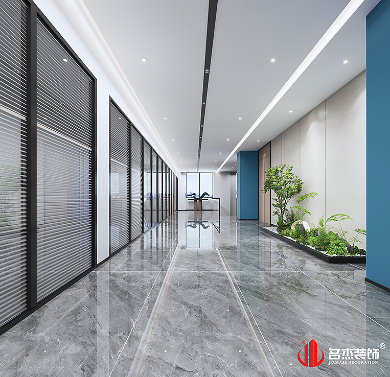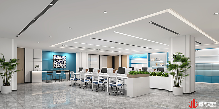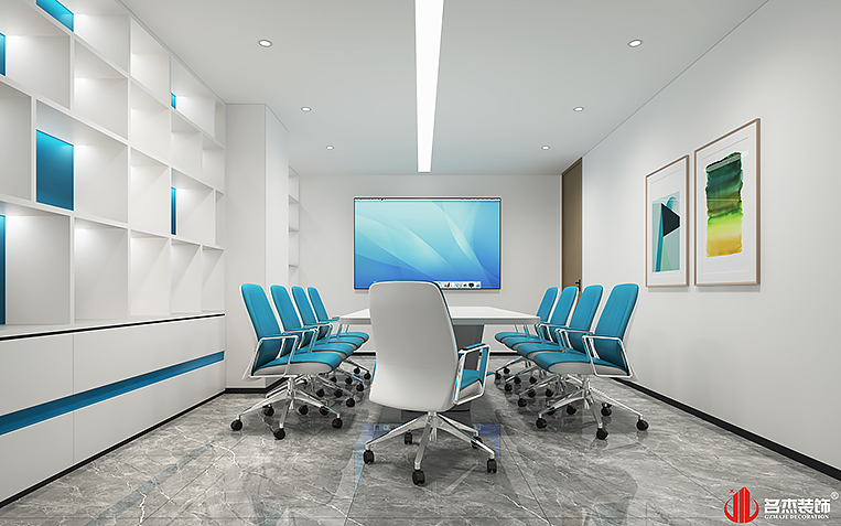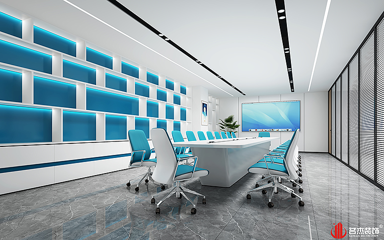 前臺區域利用層高的優勢,搭建出一個大氣且時尚的區域。在背景墻部分加入部分簡約的且不簡單的元素,讓空間變得更加有層次感,土豪金作為空間的點綴色,也為這個前臺區域增加了不少的輕奢感。大部分區域都是做了吊頂的,通過這樣的方式讓整體風格得到了統一,同時這樣簡約的吊頂也能夠給空間帶來不一樣的層次感。空間中藍色點綴也是隨處可見的,能夠很好的感受到企業文化。#工裝裝修#