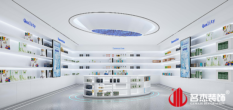 在展廳設計方面,加入了圓形吊頂元素,同時加入代表著科技的藍色色調,地面也加入圓形的元素,跟天花形成一個呼應,更加的貼合整體的設計理念。其他空間的天花吊頂則加入更多的線性元素,讓空間的流動元素更加突出。