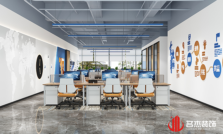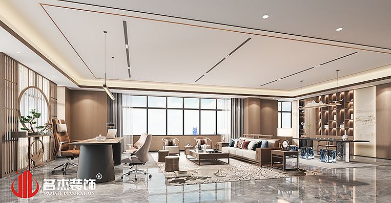 在前臺區(qū)域天花和背景墻使用鐘表元素,再加上弧形線條的加入,相互一種呼應(yīng),形成一個非常贊的企業(yè)文化對外宣傳元素。同時在展廳吊頂上面也加入鐘表元素,讓空間和展品搭配,重點突出該企業(yè)的元素,也給每個人留下一個深刻的印象。整個辦公裝修設(shè)計空間都在使用不同的線條來增加空間的層次感,以及使用設(shè)計感強烈的元素來讓空間增添更多的設(shè)計感。