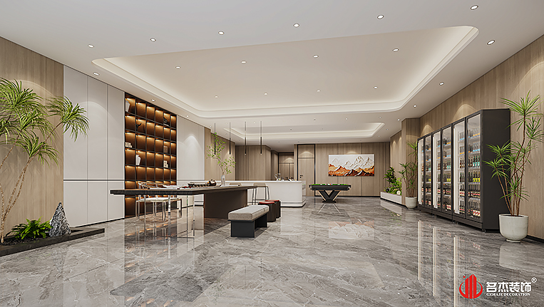 空間中的前臺(tái)接待區(qū)域使用造景的設(shè)計(jì)手法,來(lái)突出風(fēng)生水起的設(shè)計(jì)重點(diǎn),配合前臺(tái)背景墻使用的碳晶板,以及燈條作為點(diǎn)綴設(shè)計(jì)元素,搭配出不一樣的裝修設(shè)計(jì)效果。對(duì)于棋牌休閑空間來(lái)說(shuō),燈光是非常重要的元素之一,因此設(shè)計(jì)團(tuán)隊(duì)也著重在這方面上的設(shè)計(jì),通過(guò)使用造型不同的燈具,為空間增加了不少的時(shí)尚潮流感。#廣州公裝裝修公司#