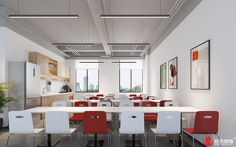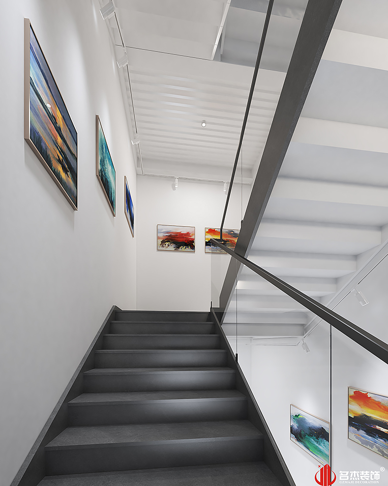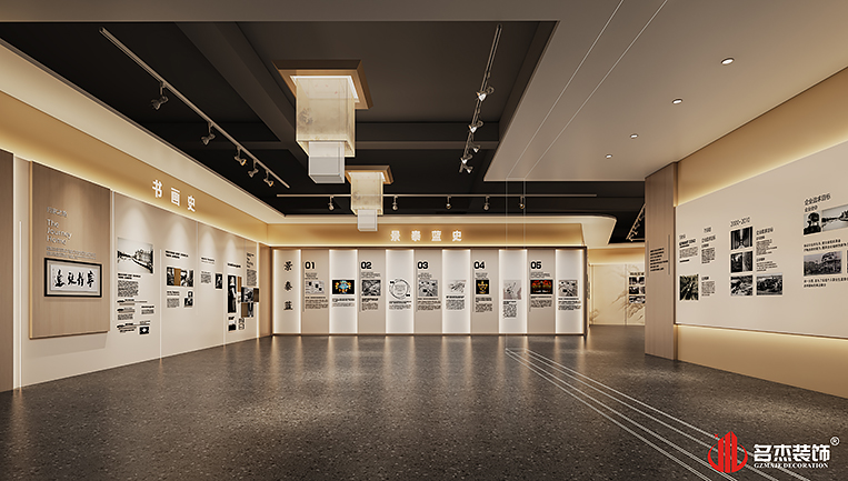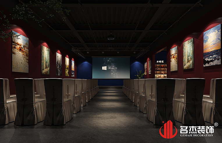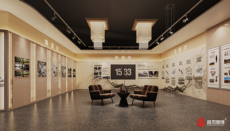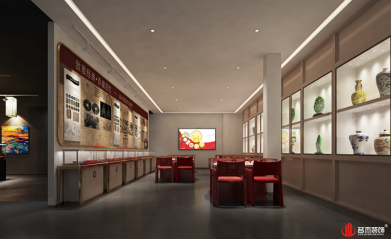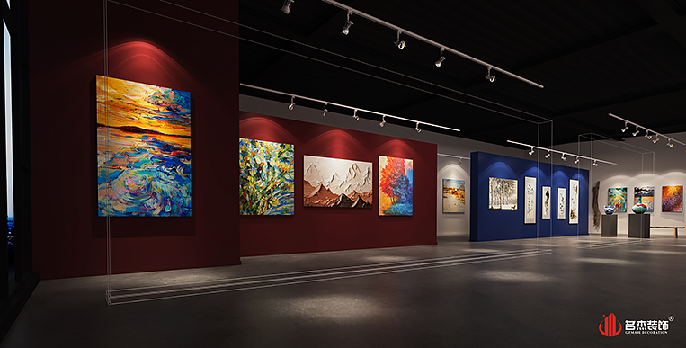 設計團隊在前臺區域使用圓形吊頂,輔以具有線條美的燈具,配合中式傳統的配色來打造這個前臺區域,讓這個區域看起來帶有濃濃的新中式風格。在展廳區域,則是使用仿燈籠造型的燈具,配合展廳的展品,來讓這個空間散發出更加濃郁的傳統氛圍。而在另一個展廳則是使用紅色和藍色,在視覺上形成一種強烈的沖擊感,讓空間看起來更加具有特色。#藝術館裝修設計#